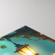 Uma bela obra de arte de parede, que apresenta uma fada sentada sobre um monstro numa floresta encantada iluminada por lanternas, bebendo uma xícara de café quente.