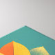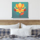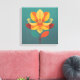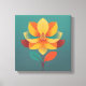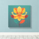 Flor ao estilo do meio século com pétalas amarelas, laranja e lacrimogêneas e folhas azuis e vermelhas sobre fundo lacrimogêneo. Minimalismo, estilo de arte simples.