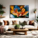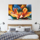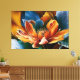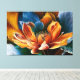 Uma flor vibrante se desdobra em um espetáculo de cores, onde pétalas alaranjadas e douradas dançam contra tons frescos de azul. A obra irradia energia, delicadeza e renovação, como se a natureza revelasse sua poesia em cada detalhe.