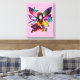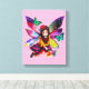 Uma fada jovem com asas vibrantes e multicoloridas ajoelha-se graciosamente, rodeada por borboletas a ferver. Ela é enfeitada em uma roupa colorida com flores acentuando o cabelo e segurando uma flor delicada em sua mão. Fundo rosa sólido