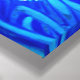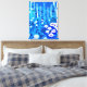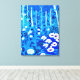 Canvas em semiabstrato de uma floresta de fantasia com flores, folhagem, árvores e aves, em tons de azul e branco de cobalto