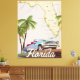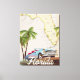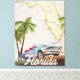 Belo mapa ilustrado do estado da Flórida e das ilhas da região em um belo estilo de vintage com um carro retrô dos anos 50.