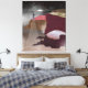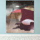 Uma bela paisagem com texturas únicas mostrando um farol do lado do penhasco e oceano noturno nebuloso com lua ascensão e céu estrelado em tons de vermelho, rosa, ouro, prata e azul.