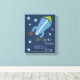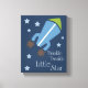 Um foguete azul e verde médio sobre um fundo azul-da-meia-noite estrelado com "Estrela Pequena Brilhante" escrita em branco. Esta é parte de um conjunto de coordenação de três peças com os impressões abaixo: com