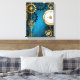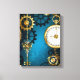 Turquesa, texturizada, fundo steampunk com latão e engrenagens douradas, chave prateada e relógio. Estilo Steampunk.