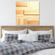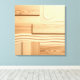 Geometric wooden panels are arranged against a textured sand backdrop, creating a visually interesting contrast between the smooth wood grain and the fine sand.