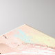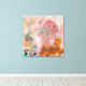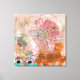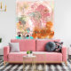 Uma composição vibrante e abstrato apresenta uma mistura de cores, incluindo rosa, marrom, laranja e chalé, com elementos florais e uma borboleta. Várias formas e linhas adicionam movimento dinâmico à peça.