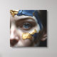 Close-up of a woman's face with cracked, dark blue skin mended with gold leaf.