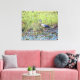 Uma fotografia de um Herão Azul Excelente atravessando um lago. O lago está coberto de lírios de água. A lagoa é confinada por plantas-tronco verdes. Imagem Copyright ©2021 Kimberly J Tilley.