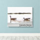 Em um dia de primavera no Alasca, dois gansos canadenses, geralmente chamados de "loucos", natações em um corpo de água ainda parcialmente sufocados com gelo. O texto personalizável que lê "Canada Goose" também é exibido. O ganso do Canadá, Branta canadensis, tem cabeça e pescoço pretos, manchas brancas na face e um corpo de cinza acastanhado. A cabeça e pescoço negros com "chinstrap" branco distinguem o ganso do Canadá de todas as outras espécies de ganso, com exceção do ganso do Barnacle, mas este tem um peito preto, e também cinzas, preferencialmentes que o castanho, plumagem corporal. O Canada Goose tem um comprimento de 30 a 43 polegadas e uma envergadura de 50 a 73 polegadas. Os homens normalmente pesam 7,1- 14 lbs e podem ser muito agressivos na defesa do território. A fêmea parece virtualmente idêntica, mas é levemente mais leve a 5,5 a 12 lb, e tem uma buzina diferente. A esperança de vida na natureza dos gansos que sobrevivem à idade adulta varia de 10 a 24 anos, os gansos do Canadá são nativos da América do Norte. Eles se reproduzem no Canadá e nos Estados Unidos nortes em uma variedade de habitats. Os ninhos encontram-se normalmente numa área elevada perto da água, como riachos, lagos, lagoas e, por vezes, num alojamento de castores. Os ovos são colocados numa depressão superficial revestida de matéria vegetal e caída. Nos últimos anos, as populações canadianas de gansos cresceram substancialmente em algumas áreas, tanto que muitas as consideram pragas por seus excrementos, bactérias em seus excrementos, ruídos e comportamentos de confronto. Este problema deve-se, em parte, à remoção de predadores naturais e a uma abundância de massas de água seguras e criadas pelo homem, como as que se encontram nos campos de golfe, nos parques e praias públicos e nas comunidades planejadas. Devido, em parte, ao cruzamento de várias subespécies migratórias com a subespécie não migratória Giant introduzida, os gansos do Canadá são frequentemente uma característica de ano para ano desses ambientes urbanos. O Canadá e os gansos chegaram naturalmente à Europa norte, como ficou provado por recuperações sonoras. As aves são, pelo menos, da subespécie parvipes, e possivelmente de outras. Os gansos do Canadá também se encontram naturalmente na Península de Kamchatka, na Sibéria Oriental, na China Oriental, e em todo o Japão. Como a maioria dos gansos, o ganso do Canadá é migratório, sendo a faixa de inverno a maioria dos Estados Unidos. Desfilando de grandes grupos canadenses que voam em forma de V sinalizam as transições para primavera e outono. Em algumas áreas, as rotas migratórias mudaram devido a mudanças nos habitats e nas fontes de comida. Em climas suaves da Califórnia até aos lagos Excelentes, parte da população tornou-se não migratória devido ao fornecimento adequado de comidas de inverno e à falta de predadores antigos. Canadá Os gansos são principalmente herbívoros, embora por vezes comam pequenos insetos e peixes. Sua dieta inclui vegetação verde e grãos. O ganso canadense come uma variedade de gramíneas quando em terra. Ele se alimenta segurando uma folha de grama com a conta, e então rasgando com um idiota da cabeça. O ganso canadense também come grãos como trigo, feijão, arroz e milho quando disponíveis. Na água, ele se alimenta de seda no fundo do corpo de água. Também se alimenta de plantas aquáticas, como algas. Em cidades urbanas, eles também são conhecidos por colher comidas de caixas de lixo. Os gansos adultos são frequentemente vistos liderando seus gansos em uma fila, geralmente com um pai na frente, e o outro na parte de trás. Ao protegerem os seus gansos, os pais frequentemente perseguem violentamente criaturas próximas, de pequenas negras a seres humanos solitários que se aproximam, depois de os avisarem, emitindo um som sibilante e atacando com picadas e batas nas asas, se a ameaça não recuar ou se tiver tomado um guloso. A maior parte das espécies que presas em ovos também vai fazer fofocas. Embora os pais sejam hostis aos gansos desconhecidos, podem formar grupos de vários gansos e alguns adultos, chamados creches.