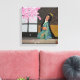 Menina em kimono senta-se em verandah fora shoji, apreciando as flores de Primavera cherry