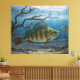 Beneath frozen water, a perch fish notices bait cast by someone ice fishing above.
