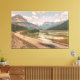 Uma cena cênica estrada de Parkway em Banff National Park, Canadá, atravessa um vale, com um rio serpenteando através da paisagem. A estrada está pavimentada e tem linhas amarelas no centro. Um veículo branco está embaçado em movimento, sugerindo velocidade. As montanhas ao fundo são majestosas e com capas de neve, com um céu azul claro acima.