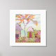 Quatro casas coloridas e balançosas com vários designs para seus telhados e portas junto com uma árvore florescente em meio a um jardim cercado, uma bonito obra de arte mestiça.