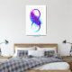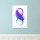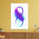 Símbolo infinito com uma bela pena pintada em cores roxas e azuis brilhantes sobre fundo branco.