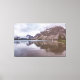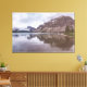 A imagem captura uma cena serena de lago montanhoso com uma superfície calma e refletora no Parque Nacional Banff, Canadá. O primeiro plano apresenta um lago de Arco tranquilo, refletindo as montanhas rochosas torrenciais ao fundo. As montanhas são robustas e imponentes, com picos de neve e encostas rochosas. O céu está coberto por uma luz suave e difusa, criando uma atmosfera tranquila e pacífica.