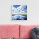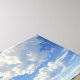 Uma paisagem serena e expansiva com uma reflexão impressionante sobre um corpo de água. A cena é dominada por uma vasta extensão de céu azul com nuvens brancas e peludas.