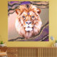 A face majestosa do leão é representada com olhos azuis brilhantes e uma joia decorativa na testa, colocada contra um fundo de tons sujos girando. O homem do leão é rico em detalhes, criando um sentido de realidade e poder.