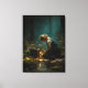 Uma jovem se ajoelha em uma floresta desmatada, cercada por letras e memórias dispersas. Um pequeno peito fica por perto, brilhando suavemente no crepúsculo mágico. Uma cena profundamente emocional de nostalgia e descoberta envolta em calcanhar poético romântico.
