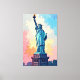 A Estátua da Liberdade é alta contra um céu vibrante, simbolizando a liberdade e a esperança com uma reviravolta colorida.