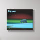 Um urso polar vagueia o gelo durante a longa noite polar; o Norte brilha em vermelho e verde à distância. A leitura de texto "Alaska" em azul e branco brilhantes também é exibida.