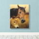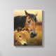 Uma linda mãe de quarto de cavalo olha com carinho para o seu colt bebê. A pacífica cena equestre tem um pano de fundo mudo do pasto.