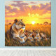 Eine stolze Löwenfamilie ruht gemeinsam in der afrikanischen Savanne unter einem warmen Sonnenuntergang. Das Bild symbolisiert Stärke, Zusammenhalt und natürliche Schönheit. Ideal für Tierliebhaber, Naturliebhaber oder als kraftvolles Dekorationsmotiv.