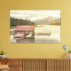 Uma cena pitoresca de uma casa de barco de madeira no lago Maligne, Jasper National Park, Canadá, aninhada em meio a um pano de fundo de montanhas com capas de neve e uma floresta exuberante. A casa de barco tem um telhado vermelho com jato branco e as palavras "Casa de Barcos do Lago Maligno" pintadas nela. Várias canoas vermelhas e brancas estão encaixadas no píer de madeira, suas reflexões jorrando na água calma.