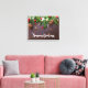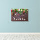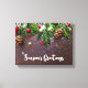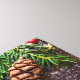 Tela impressa com uma fotografia rústica de uma mesa de madeira marrom com pinecones, agulhas de pínus, neve e Enfeites de natal. Festivo e adorável.