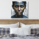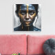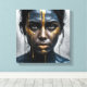 A woman's face, painted in deep blues and blacks, is dramatically accented with thick, dripping streaks of gold paint. Her expression is stoic and intense.