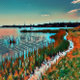 Mistura moderna de cores brilhantes de queda, segue a linha de costa desta baía silenciosa. Uma via costeira segue a borda do litoral. Adição perfeita à decoração de casa ou escritório.