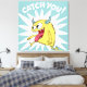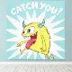 Monstro amarelo de desenho animado com pequenos chifres, boca aberta e uma língua grande correndo para frente com o engraçado texto "Pegue você" em um fundo azul claro. Ilustração perfeita para crianças roupa, arte infantil na parede, papelaria divertida, adesivos e designs de caráter divertido que espalham humor e alegria.