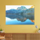 Uma fotografia serena captura um tranquilo lago prateado no meio de montanhas torrenciais. A superfície da água reflete o majestoso Pico de Carson, criando uma imagem espelhada da paisagem ao redor. O céu acima é um azul macio e pálido, sugerindo uma atmosfera calma e pacífica.