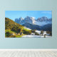 Canvas de paisagem impressão de uma imagem de uma loja de fotos composta por duas fotos tiradas com dois dias de intervalo, mostrando a mudança de estação do outono para o inverno. A aldeia é Rua. Magdalena (Papais noeis Maddalena) no Vale do Funes, no Tirol do Sul, Itália, com as montanhas Odle Dolomites ao fundo.