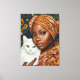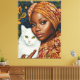 Um retrato cativante de uma jovem africana em um embrulho de cabeça de padrão vibrante, segurando suavemente um gato branco, colocado contra um fundo botânico exuberante.