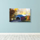 A Impressão rusta de Canvas de ponte coberta pela rusticidade apresenta uma fotografia de queda cênica digitalmente aprimorada e amolecida de uma ponte de madeira vermelha e curvada com folhas coloridas e céu azul no fundo, localizado em Parke County, Indiana. Esta charmosa ponte coberta foi construída em 1882 por J.A. Britton sobre o Sugar Creek na Estrada Narrows perto do Parque Estadual da Corrida da Turquia. Esta impressão de canvas personalizada faz uma ideia de presente de excelente ou lembrança da sua visita ao condado de Parke, Indiana.