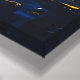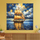 Belamente renderizada nave à vela contra um céu dramático. A nave possui velas grandes e ondulantes que captam a luz, criando uma matiz quente e ouro. O fundo está cheio de azuis ricos e nuvens escuras intercaladas com destaques vibrantes do ouro, sugerindo um pôr do sol ou nascer do sol. A água serena reflete as cores do céu, melhorando a tranquilidade geral da cena. A textura da pintura dá sentido de movimento às ondas e às velas, convidando os espectadores a imaginar o navio navegando pelas águas abertas.