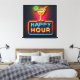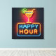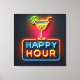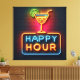 Luzes néon brilhantes exibem a mensagem "Happy Hour" e o gráfico do coquetel em um fundo de tijolos