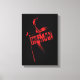 Gráfico vermelho estilizado de Batman segurando sua capa com o logotipo teatral do Batman em cima.