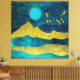 design de paisagem da montanha abstrato em tons de ouro, ciano e azul em tons negros, com um nascer, estrelas e pássaros.