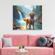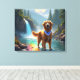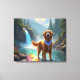 Um belo Ouro Retriever em uma floresta encantada vibrante e rio arco-íris.
