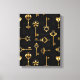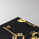 Padrão perfeito de chaves antigas, douradas e silhuetas em fundo preto.