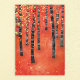 Pintura de um pássaro ou de uma floresta escaneada no outono. Florestas de abstrato vermelho, laranja e amarelo.