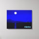 Moonrise na Passagem de Dentro ao largo da costa do Alasca. Montanhas à distância e um barco de pesca dirige-se para norte. A leitura de texto "Alaska" aparece em azul e branco brilhantes.