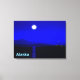 Moonrise na passagem de Dentro do casaco do Alasca. Montanhas à distância e um barco de pesca dirige-se para norte. A leitura de texto "Alaska" aparece em azul e branco brilhantes.