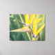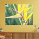 Uma foto de perto de um pássaro vibrante da flor do Paraíso, mostrando sua estrutura única e impressionante. A flor apresenta pétalas amarelas brilhantes com uma dica de laranja na base, contrastando lindamente com os acentuados azuis-roxos profundos. As pétalas estão dispostas numa forma graciosa, quase semelhante a um pássaro, dando à flor o seu nome distintivo.