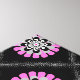 Flor liso com múltiplas camadas de pétalas em tons de preto, cinza, branco e rosa.