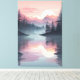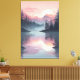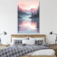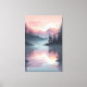 Um grande sol pálido se põe atrás de camadas de montanhas de cor rosa, perfeitamente espelhadas em um lago tranquilo com pinheiros silenciosos. Essa cena tranquila evoca calma e serenidade, fazer uma peça de parede ideal para amantes de mínima arte natural e tons de calmante.