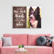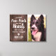 Tela personalizada de memorial de animal de estimação com uma foto do seu amado animal de estimação, um efeito de fundo de madeira rústica e uma citação de pesar que diz "você deixou marcas de patas nos nossos corações e nós somos para sempre mudados", uma marca de pata, coração, o nome do seu animal de estimação e as datas. Um lindo souvenir e tributo ao seu precioso cão ou gato da família.
