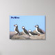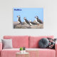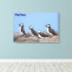Puffins em repouso nas rochas. Leitura personalizável de texto, "Puffins" também é exibido. A Puffin do Atlântico (Fratercula arctica) se alimenta principalmente por mergulho na água. Criam-se em grandes colônias em penhascos costeiros ou ilhas offshore no Atlântico Norte. Os alfinetes derramaram as partes coloridas das suas contas após a época de reprodução, deixando um bico menor e mais aborrecido. Suas asas curtas são adaptadas para nadar com uma técnica voadora sob água. No ar, batem suas asas rapidamente (até 400 vezes por minuto) em um voo rápido, muitas vezes voando baixo sobre a superfície do oceano.